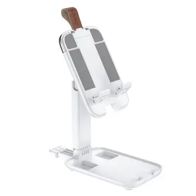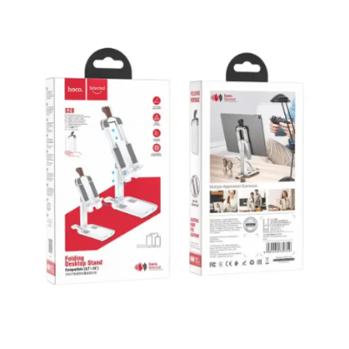 Hoco S28 - настільна підставка, яка підходить як для телефонів, так і для планшетів. Дозволяє розміщувати гаджети вертикально і горизонтально, забезпечуючи надійну фіксацію пристрою.Конструкція має складну конструкцію, яку можна взяти з собою у відрядження або поїздку. У складеному вигляді займає зовсім мало місця - всього 124*83*26мм, в розкладеному вигляді 175*83*245мм. Розсувна система фіксації підходить для телефонів з діагоналлю 4.7-14 дюймів.Підставка виготовлена з міцного ABS-пластика і алюмінієвого сплаву. Надійна опора гарантує хорошу стійкість. А вставки золотого кольору і шкіряний ремінець надають вишуканості дизайну.
