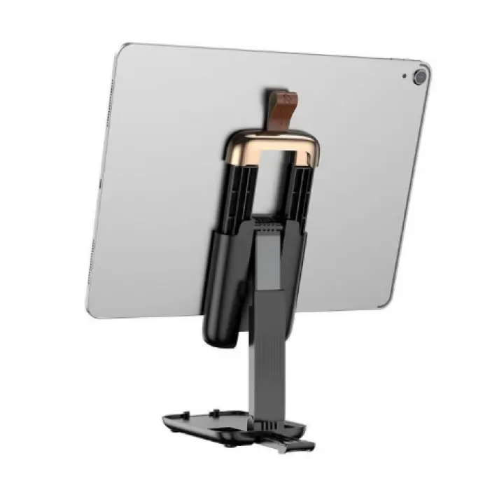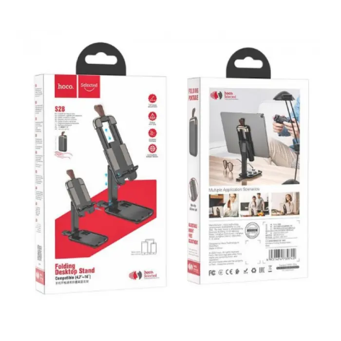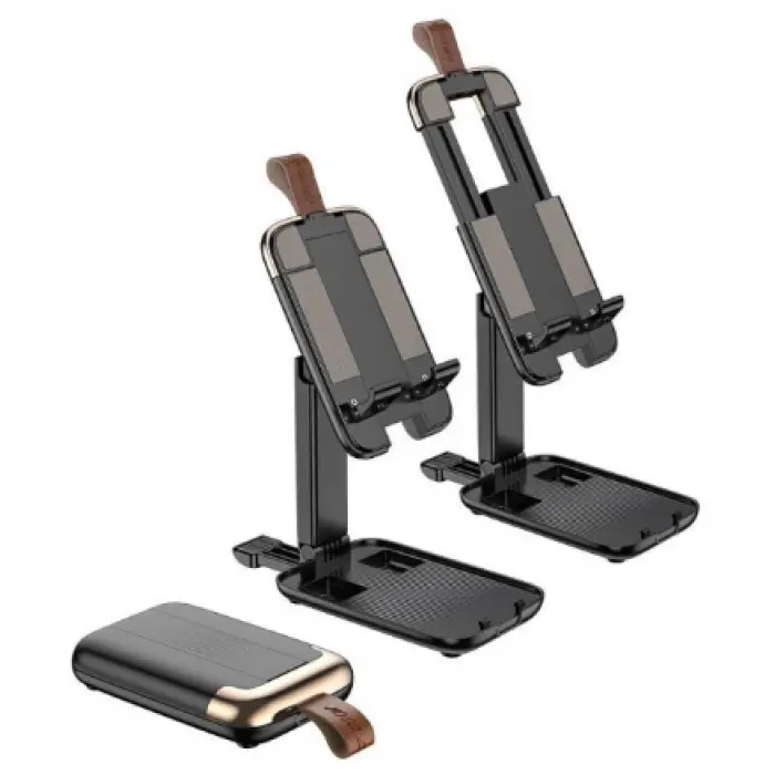 Hoco S28 - настільна підставка, яка підходить як для телефонів, так і для планшетів. Дозволяє розміщувати гаджети вертикально і горизонтально, забезпечуючи надійну фіксацію пристрою.Конструкція має складну конструкцію, яку можна взяти з собою у відрядження або поїздку. У складеному вигляді займає зовсім мало місця - всього 124*83*26мм, в розкладеному вигляді 175*83*245мм. Розсувна система фіксації підходить для телефонів з діагоналлю 4.7-14 дюймів.Підставка виготовлена з міцного ABS-пластика і алюмінієвого сплаву. Надійна опора гарантує хорошу стійкість. А вставки золотого кольору і шкіряний ремінець надають вишуканості дизайну.