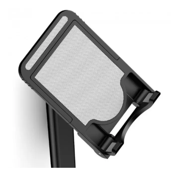 Данная модель прекрасно подойдет не только для комфортного обучения, но и для просмотра фильма. Настольный держатель не занимает много места, тем самым позволяет без проблем хранить на рабочем столе все необходимые вещи. Высоту ножки девайса можно регулировать, от 11 до 15 см, а также настроить угол наклона в зависимости от потребности. Дизайн выполнен в элегантном черном цвете, поэтому подставка станет неизменным помощником, прекрасно впишется в интерьер вашей комнаты. Преимуществом является зарезервирован порт для зарядки, с нескользящим силиконом.