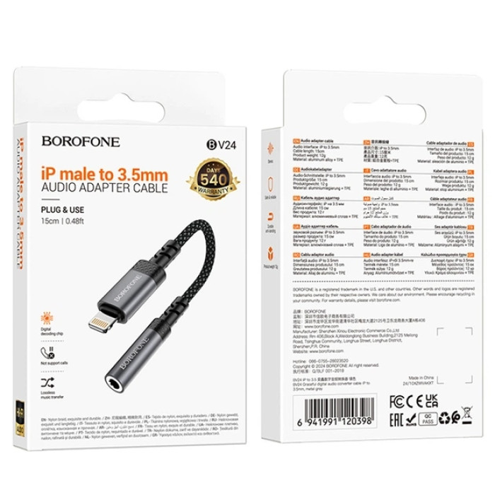Borofone BV24 — високоякісний аудіо‑перехідник‑кабель, який дозволяє підключати дротові навушники, навушники‑гарнітури або інші аудіопристрої зі стандартним 3.5 мм роз’ємом до пристроїв Apple з роз’ємом Lightning. Це зручне рішення для власників iPhone чи iPad, у яких немає стандартного аудіо‑гнізда.