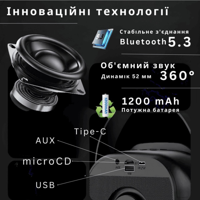 Пристрій створений з урахуванням мобільного використання. Колонку легко переносити та використовувати в різних умовах, включаючи домашні вечірки, святкування на природі або дитячі заходи. Автономна робота забезпечує свободу використання без постійного підключення до електромережі.