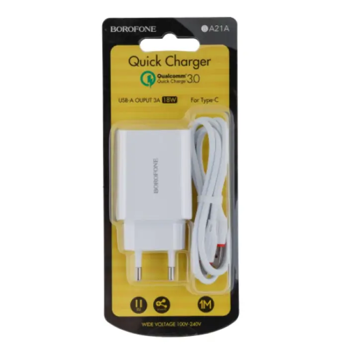 Сетевое зарядное устройство Borofone 1USB BA21A Type-C QC3.0 White, Белый