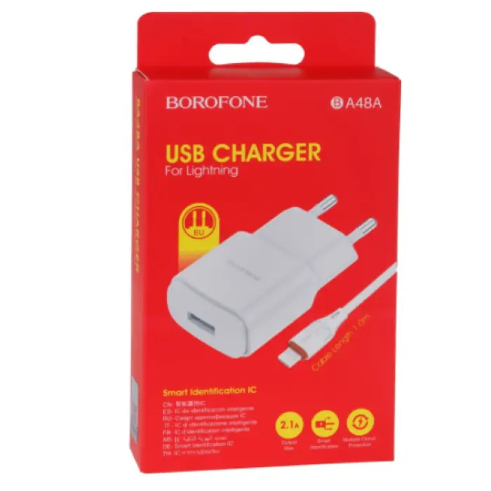 Сетевое зарядное устройство Borofone BA48A Lightning быстро восполнит уровень заряда ваших гаджетов. Адаптер идентифицирует заряжаемое устройство и автоматически регулирует выходную мощность. Модель компактна и удобна в использовании, встроенный предохранитель гарантирует безопасную работу. Выходное значение силы тока - 2,1 А. Детали корпуса выполнены из огнестойкого поликарбоната высокого качества, что обеспечивает дополнительную безопасность и делает тактильные ощущения владельца устройства очень приятными. Аксессуар оснащен одним портом USB, его вертикальный вариант расположения внесет практичное дополнение в пользование устройством. В комплект входит надежный USB кабель Lightning, характеристики которого не допускают падения выходного тока и напряжения. Длина кабеля - 1 м.