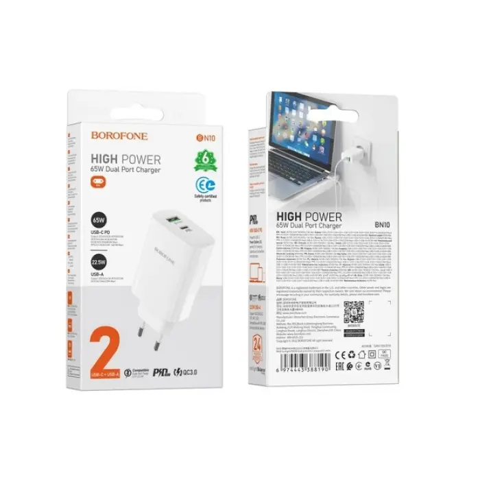 Сетевое зарядное устройство Borofone BN10 PD+QC (65W) White, Белый
