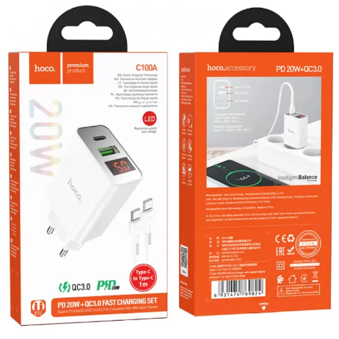 Сетевое зарядное устройство Hoco C100A Type-C to Type-C - это функциональный адаптер, разработанный для быстрой, безопасной зарядки гаджетов. Аксессуар предлагается в стильном белом цвете, реализован в оригинальном дизайне, привлекающим внимание зеркальной панелью торца, которая идеально сочетается с его глянцевой поверхностью. Небольшие размеры, приятная на ощупь поверхность и скругленные ребра сделают его повседневную эксплуатацию максимально комфортной. Для изготовления устройства используется огнеупорный поликарбонат, ABS пластик и качественные электронные компоненты. На его нижнем торце находится сетевая вилка стандарта EU, а на верхнем - разъемы Type-C, USB и LED дисплей, который попеременно отображает текущие значения исходящих тока и напряжения. Разъем USB поддерживает зарядку по протоколам QC, AFC и FCP с максимальной мощностью 18Вт, а Type-C - дополнительно PD с мощностью до 20Вт. Общая сила на выходе разъемов составляет 3А при напряжении 5В. Адаптер комплектуется кабелем Type-C - Type-C .