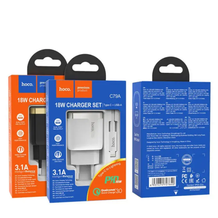 Hoco C79A Zeus PD 18W 3.1A + USB Type-C to Lightning Cable — это зарядное устройство для для телефона, для планшета. Устройство обеспечит необходимую мощность и силу тока, поможет максимально долго сохранить работоспособность встроенного аккумулятора и восполнение заряда за минимальный срок. В случае необходимости его можно использовать и для других устройств, единственное — учитывайте совместимость разъемов и мощность энергии.