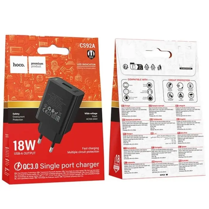 Практичный и компактный сетевой адаптер Hoco CS92A Leader с одним портом USB-A предназначен для быстрой и надежной зарядки современных гаджетов. Благодаря поддержке технологии Quick Charge 3.0, устройство обеспечивает ускоренное питание с выходной мощностью до 18Вт, что значительно сокращает время зарядки по сравнению с обычными адаптерами.