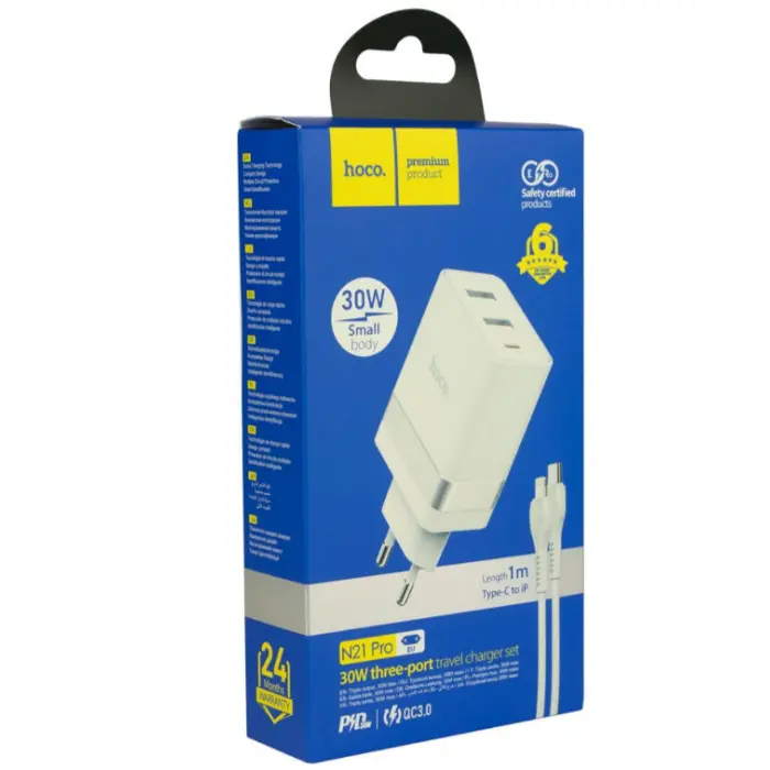 Сетевое зарядное устройство Hoco N21 Pro 1PD+2USB 30W + Кабель Type-C to Lightning White, Белый