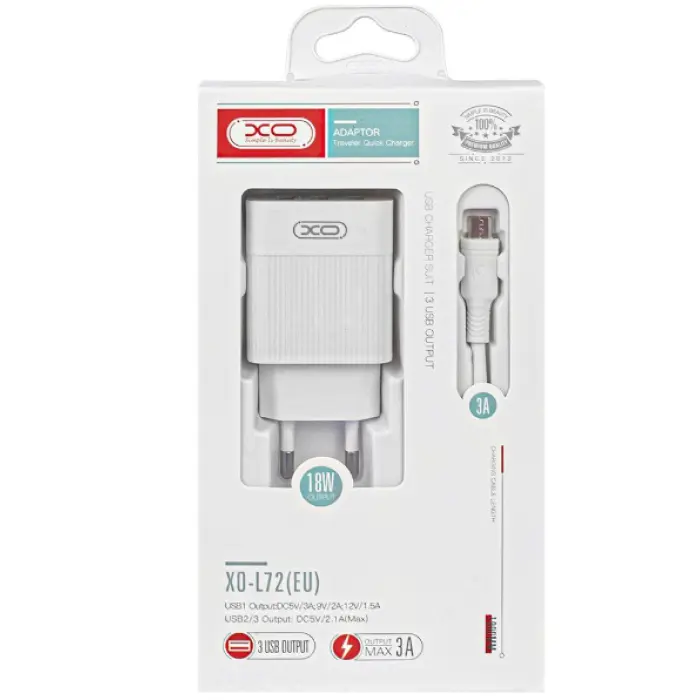 Сетевое зарядное устройство XO L72 гарантирует быструю и безопасную зарядку для любого смартфона. Контроль напряжения осуществляется за счет интегральной микросхемы, для предохранения вашего гаджета. Удобная форма корпуса. В комплекте предусмотрен кабель USB. Выходная мощность имеет стабильный показатель, что делает процесс зарядки безопасным. Корпус выполнен в классической цветовой гамме. С помощью 3 USB портов возможно подключить сразу три устройства. Если вам требуется устройство для быстрой подзарядки различных устройств, то стоит рассмотреть покупку зарядки с поддержкой функции Quick Charge 3.0