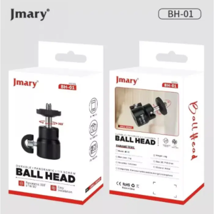 Jmary BH-01 — это универсальный шарнирный крепеж с поворотом на 360°, который обеспечивает гибкую и надежную установку LED ламп, камер, фотоаппаратов, GoPro и других устройств на штатив. Благодаря стандартной резьбе 1/4", крепление совместимо с большинством оборудования для фото- и видеосъемки.