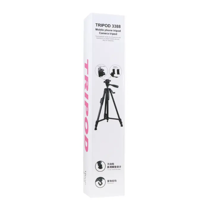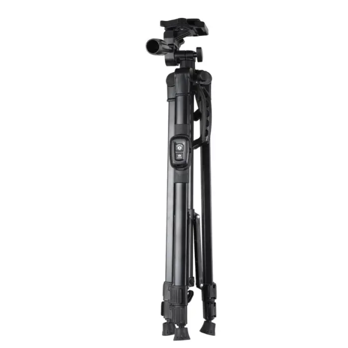 Штатив 3388 1.4м Remote - це високоякісний трипод, який покращить якість фото та відеозйомки на вашу камеру або смартфон. Крім того, він може бути використаний для розміщення різного обладнання, такого як відбивачі та лампи. Його надійна конструкція гарантує безпеку вашого обладнання та дозволяє легко регулювати висоту, поворот та кут нахилу. У складеному вигляді він дуже компактний, з довжиною близько 0.5м та невеликою вагою, що робить його легким у транспортуванні. Його центральна стійка та телескопічні ніжки з трьома секціями виготовлені з міцного алюмінієвого сплаву, а ніжки мають прогумовані накладки та фіксатори для безпечного розташування. Штатив має інтегрований слот для зберігання пульта дистанційного керування, що дозволяє керувати камерою або смартфоном з відстані. Завдяки своїй головці з міхуровим рівнем і знімним майданчиком з різьбовим кріпленням, ви можете фіксувати ваше обладнання як вертикально, так і горизонтально, а зручна ручка дозволяє нахиляти і обертати головку на всі 360°. Крім того, до комплекту входить універсальний тримач для смартфона.