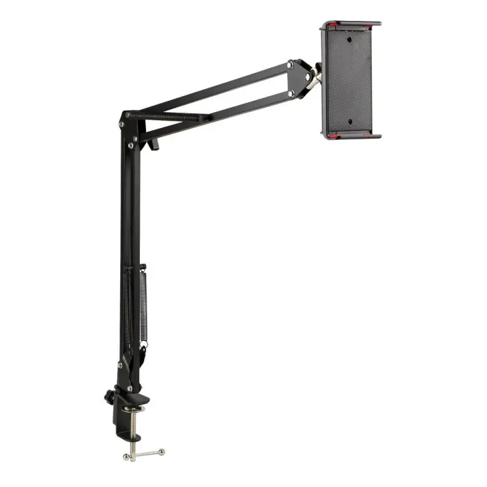 Підпружинений штатив-пантограф на струбціні - це простий в експлуатації пристрій, який допоможе розташувати смартфон або планшет у зручному положенні: на потрібній висоті і під потрібним кутом. Цей аксесуар вирізняється винятковою надійністю, практичністю та універсальністю. Він сумісний з більшістю моделей смартфонів та планшетів, може використовуватися вдома, в офісі чи навчальному закладі. Кріплячись на краю столу або полиці він лаконічно впишеться в будь-який інтер'єр, не займе багато місця і не відволікатиме на себе увагу у складеному вигляді. Кожен із двох важелів штатива має довжину близько 350мм, оснащений двома пружинами і складається з двох паралельних напрямних, що у поєднанні з шарнірними з'єднаннями забезпечує можливість гнучкого налаштування висоти та кута нахилу. Шарнір біля основи дозволяє повертати штатив на всі 360°, а центральний шарнір у місці з'єднання важелів повністю скласти їх і розкласти з кутом від 0° до 180° по відношенню один до одного. За допомогою гвинтового затиску, виконаного на кшталт струбцини, його можна закріпити на краю столу або полиці завтовшки до 5.5см. Штатив комплектується двома власниками (для смартфона та планшета), які легко кріпляться кульовим шарніром на торці верхнього важеля.