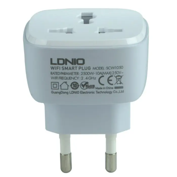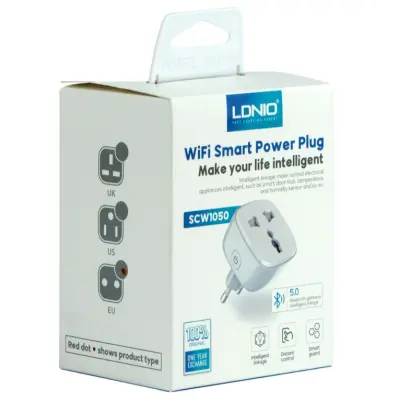 Смарт розетка WiFI Smart Power Plug LDNIO SCW1050 – технологический аксессуар, который поможет превратить любое подключаемое к электросети устройство в разумный гаджет. Эта модель является обычным сетевым переходником, оснащенным модулем Wi-Fi для удаленного управления питанием со смартфона. Он станет отличным выбором для использования в сочетании с ночными лампами, увлажнителями воздуха, кондиционерами, чайниками, вентиляторами, адаптерами для подзарядки портативных гаджетов и многими другими устройствами. Аксессуар имеет небольшие размеры и вес, его корпус выполнен в стильной, практичной форме и имеет приятную на ощупь глянцевую поверхность, изготовленную из поликарбоната, отличающегося чрезвычайной прочностью и способностью выдерживать температуру до +850 °C. Модель оснащена одной универсальной розеткой, совместимой с наиболее распространенными типами сетевых вилок, и кнопкой со встроенным индикатором LED для включения и установки беспроводного подключения и последующей настройки времени включения и выключения.