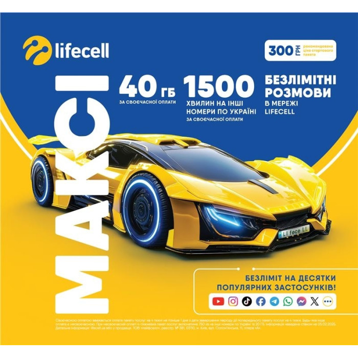 Стартовий пакет Lifecell «Максі» — це збалансований тариф з великим обсягом інтернету, значним пакетом хвилин для дзвінків по Україні та безлімітним доступом до популярних застосунків. Він поєднує вигідну вартість, сучасні можливості мобільного зв’язку та зручність використання, що робить його чудовим вибором для щоденного користування смартфоном.