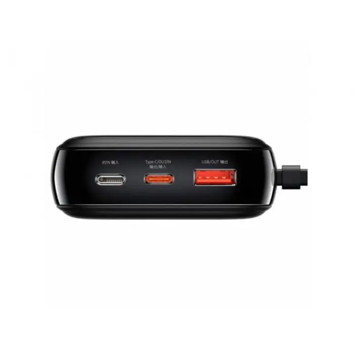 Power Bank Baseus удивит вас своими материалами сборки. Устройство небольшое и удобное, но емкое — целых 20000 мАч. Сбоку есть кабель Lightning, который вы можете использовать для подключения мобильного телефона и начала зарядки. Акцент также должен быть сделан на ручке(шнурке), используемой, например, для переноски аккумулятора питания или прикрепления его к рюкзаку.