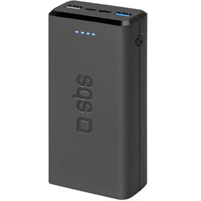 Повербанк SBS 20000 MAH оборудован четырьмя светодиодами, сигнализирующими о оставшейся величине емкости, каждый из которых соответствует 25% от ее максимального значения.