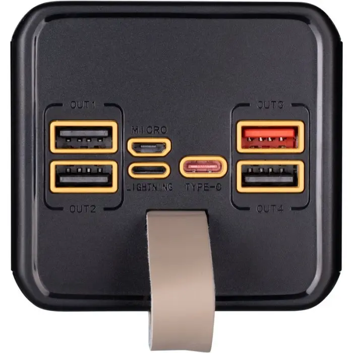 Модель оснащена чотирма вихідними портами USB-A, що дає можливість одночасно заряджати до чотирьох пристроїв. Окрім цього, передбачено двонаправлений порт Type-C — його можна використовувати як для заряджання самого повербанка, так і для живлення інших гаджетів.