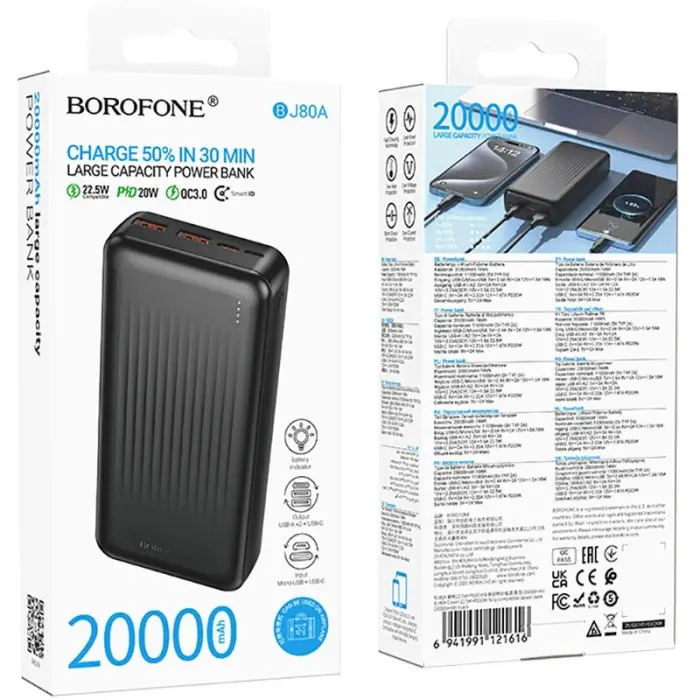 Borofone BJ80A – это мощный и универсальный павербанк емкостью 20000 мА·ч, который обеспечивает быструю и стабильную зарядку смартфонов, планшетов и других гаджетов в любой ситуации. Модель поддерживает современные протоколы быстрой зарядки PD до 20W и QC до 22.5W, что позволяет сократить время восстановления заряда устройств.