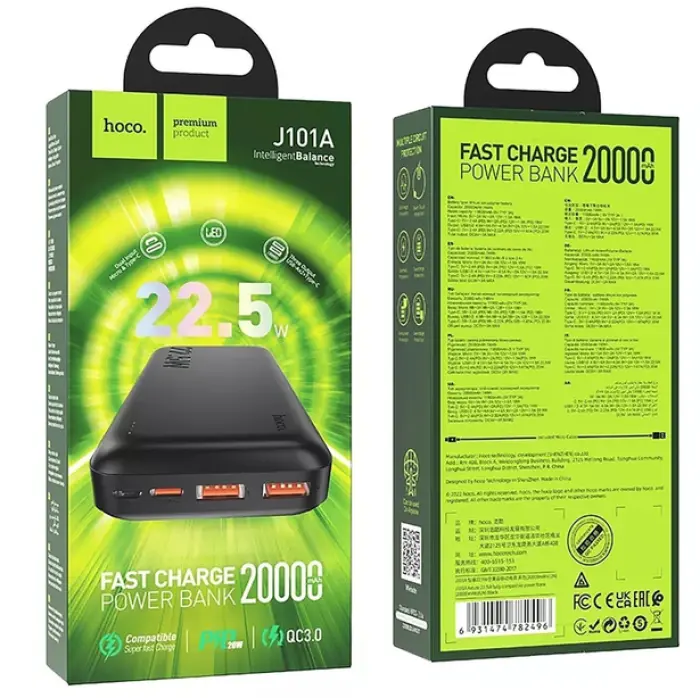Hoco J101A Astute – универсальный мобильный аккумулятор высокой емкости и мощности. Оснащен качественной батареей на 20000 мАч и мощностью заряда 22.5W, что позволяет быстро заряжать устройства. Идеально подходит для тех, кто часто путешествует или находится вдали от электросети.