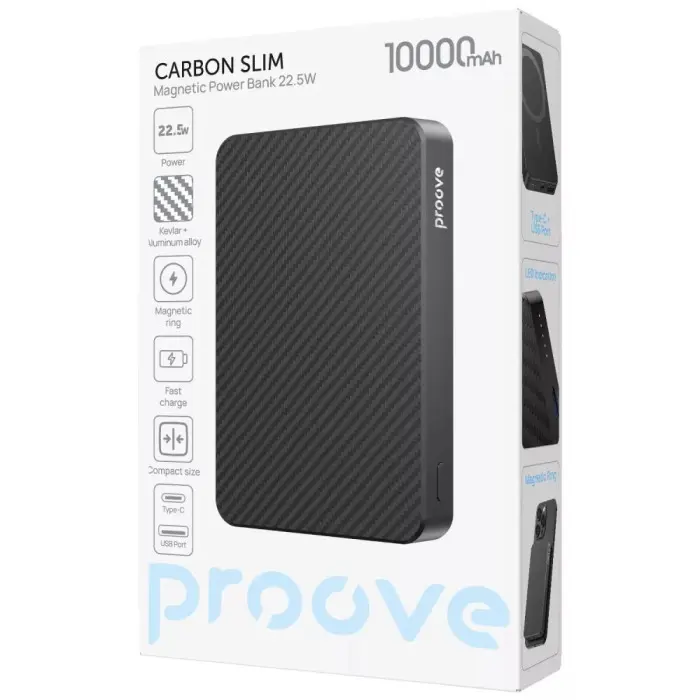 Proove Carbon Slim 10000мАч – это павербанк, созданный для пользователей, нуждающихся в сочетании большой емкости и компактности. Аккумулятор 10000мАч обеспечивает длительную автономность для смартфонов, наушников, смарт-часов, планшетов и Type-C-совместимых устройств. Поддержка беспроводной зарядки Qi позволяет восстанавливать заряд без проводов – просто разместите телефон на зарядной зоне. Двусторонний порт Type-C работает и на вход, и на выход, поэтому кабель требуется только один.