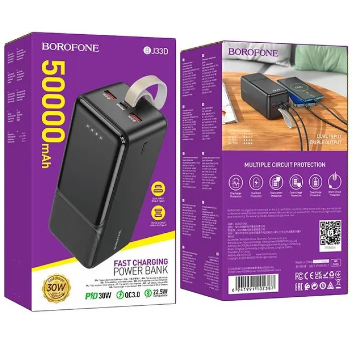 Универсальная мобильная батарея ПовербанкBorofone BJ33D PD30W 50000mAh Чорний