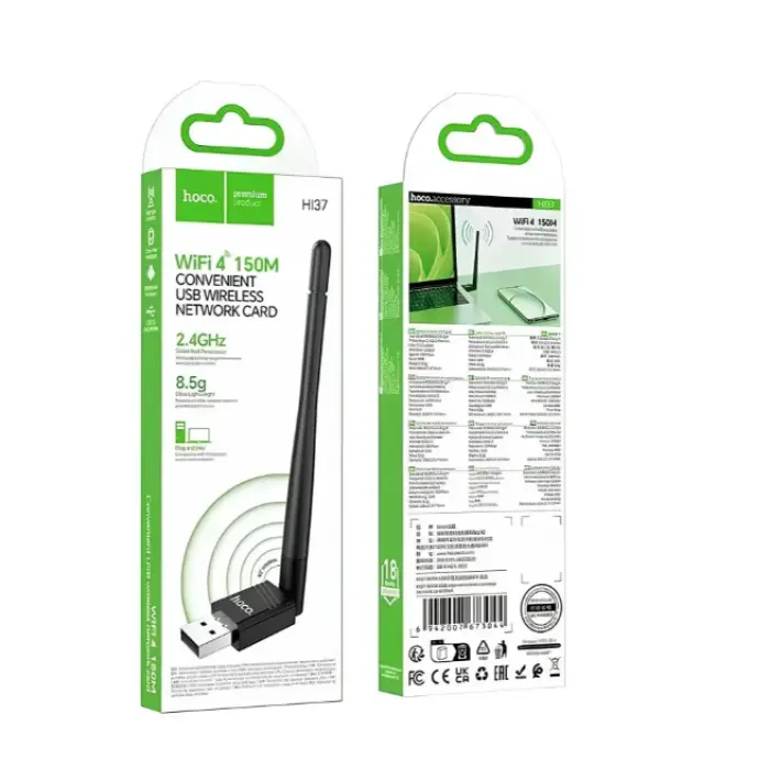 USB Wi-Fi адаптер Hoco HI37 — це доступне та зручне рішення для підключення комп’ютера або ноутбука до бездротової мережі. Пристрій особливо корисний для стаціонарних ПК без вбудованого Wi-Fi або у випадках, коли потрібно покращити прийом сигналу.